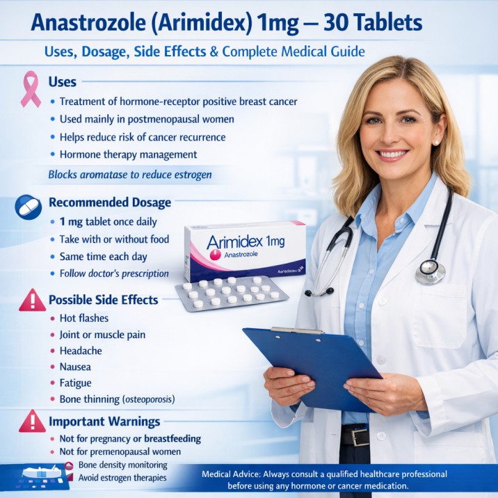 Anastrozole (1mg) Arimidex 1mg X 30 Tablets is an important medication in hormone-based breast cancer treatment. By reducing estrogen levels in the body, it helps slow cancer growth and lower the risk of recurrence in many patients.