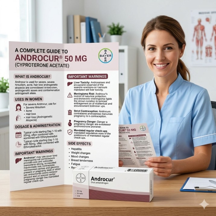 Androcur 50 mg is a prescription medicine that contains cyproterone acetate, a powerful anti-androgen. It’s mainly used to reduce excessive male hormones (androgens) in conditions like prostate cancer, severe acne, excessive hair growth (hirsutism), and certain hormone-related disorders in men and women.