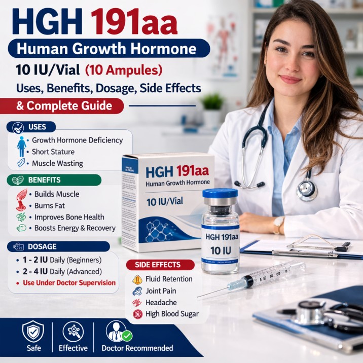 HGH 191aa Human Growth Hormone 10 IU/Vial (10 Ampules) is a synthetic version of natural human growth hormone designed to support growth, cell repair, metabolism, and recovery. It’s commonly used under medical supervision for growth hormone deficiency, muscle recovery, anti-aging therapies, and metabolic support. Each pack typically includes 10 ampules of 10 IU recombinant HGH, formulated to mimic the body’s natural hormone structure (191 amino acids).