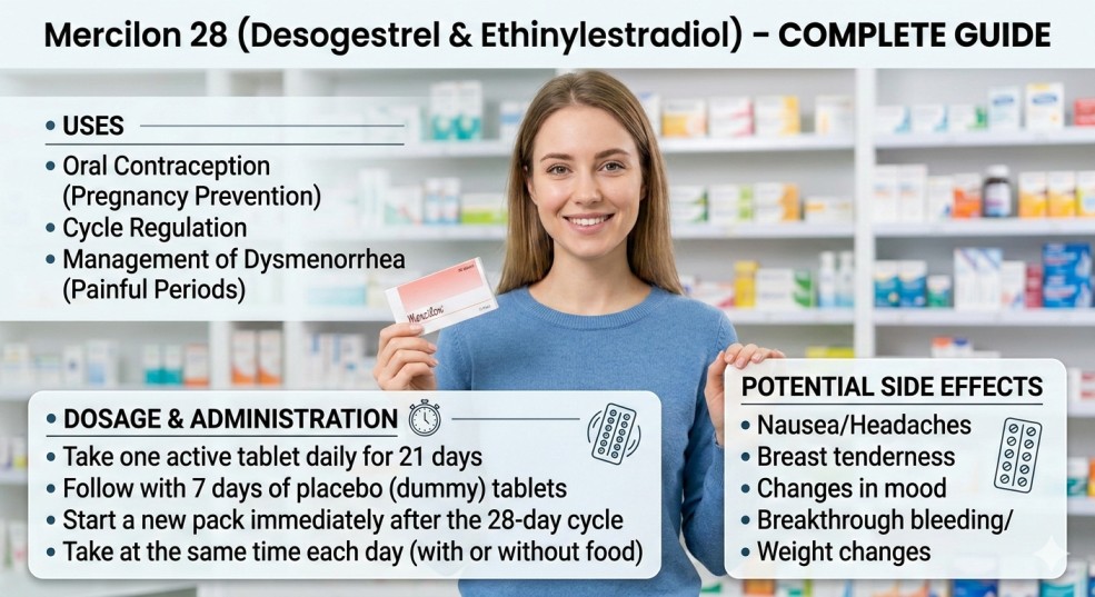 Mercilon 28 (Desogestrel 0.15 mg + Ethinylestradiol 0.02 mg) is a low-dose combined oral contraceptive pill used to prevent pregnancy. It contains 28 tablets per pack (21 active + 7 reminder pills) and is taken once daily to provide reliable birth control when used correctly.
