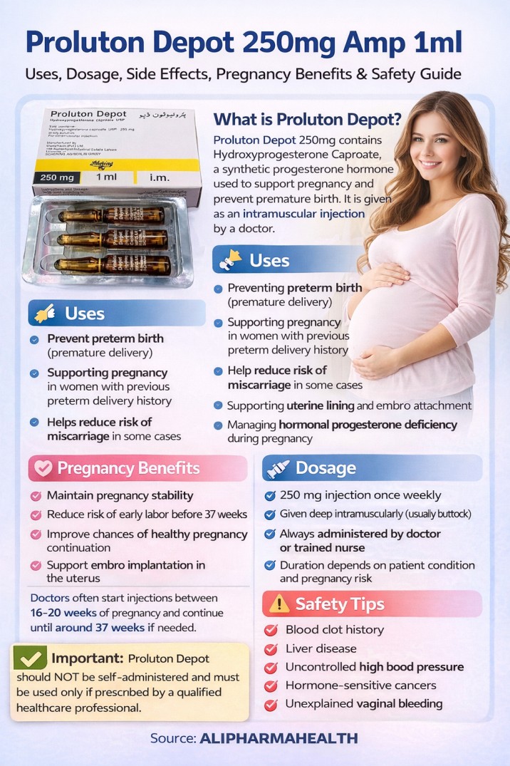 Proluton Depot 250mg Amp 1ml is a progesterone-based hormonal injection commonly prescribed to help support pregnancy and reduce the risk of miscarriage caused by low progesterone levels. It contains Hydroxyprogesterone Caproate, a long-acting hormone that helps maintain the uterine lining and supports healthy pregnancy development. Doctors may also prescribe it for certain menstrual disorders or hormonal imbalances.