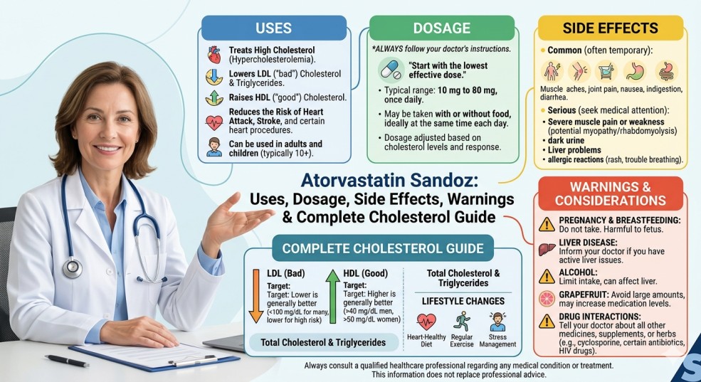 Atorvastatin Sandoz is a prescription medicine used to lower cholesterol and reduce the risk of heart disease, stroke, and heart attacks. It works by decreasing “bad” LDL cholesterol and triglycerides while helping increase “good” HDL cholesterol. Doctors usually prescribe it for people with high cholesterol, cardiovascular risk, or diabetes-related heart risks.