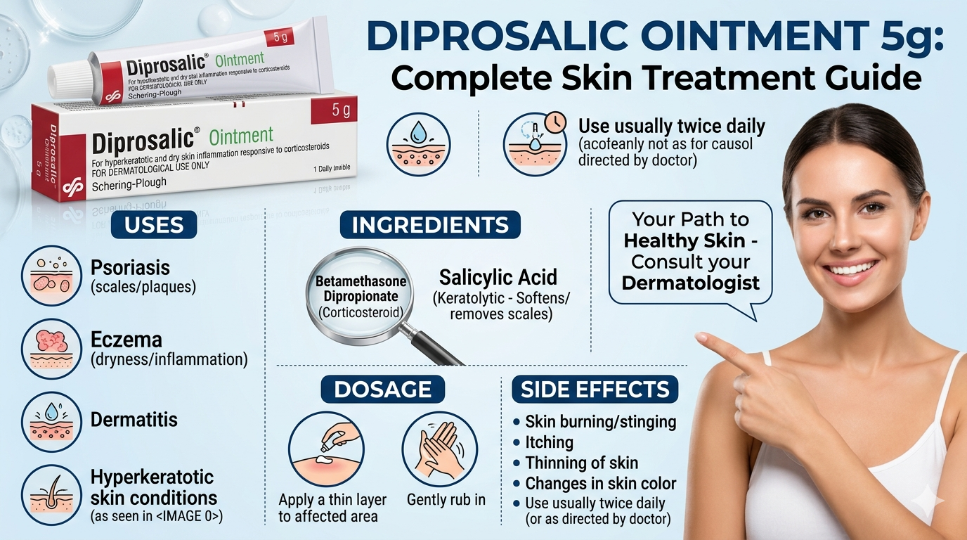 Diprosalic Ointment 5g is a topical prescription medicine commonly used to treat psoriasis, eczema, and other inflammatory skin conditions with thick or scaly skin. It contains Betamethasone Dipropionate (a corticosteroid) and Salicylic Acid (a keratolytic agent). Together, these ingredients help reduce redness, swelling, itching, and skin scaling, while also softening hardened skin so the medicine can work better.
