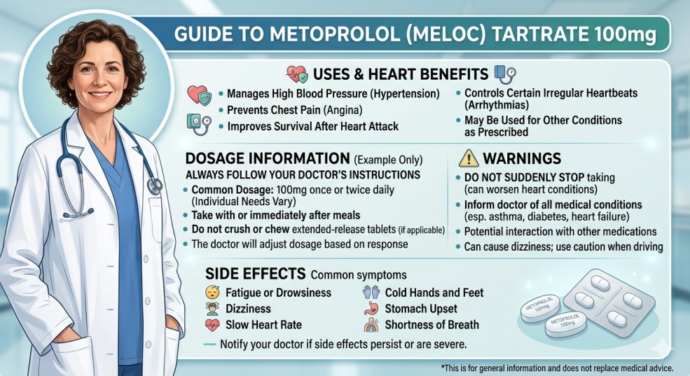 Metoprolol (Meloc) Tartrate 100mg is a prescription beta-blocker used to treat high blood pressure, chest pain (angina), heart rhythm problems, and to prevent heart attacks. It works by slowing the heart rate and reducing the workload on the heart, which helps improve blood flow and lower blood pressure.
