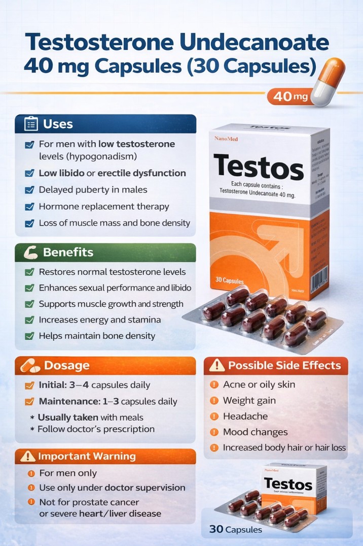 Testosterone Undecanoate 40 mg capsules are oral testosterone replacement medicines used to treat low testosterone levels (male hypogonadism). They help restore normal hormone levels, which can improve energy, muscle strength, libido, mood, and overall well-being in men diagnosed with testosterone deficiency.